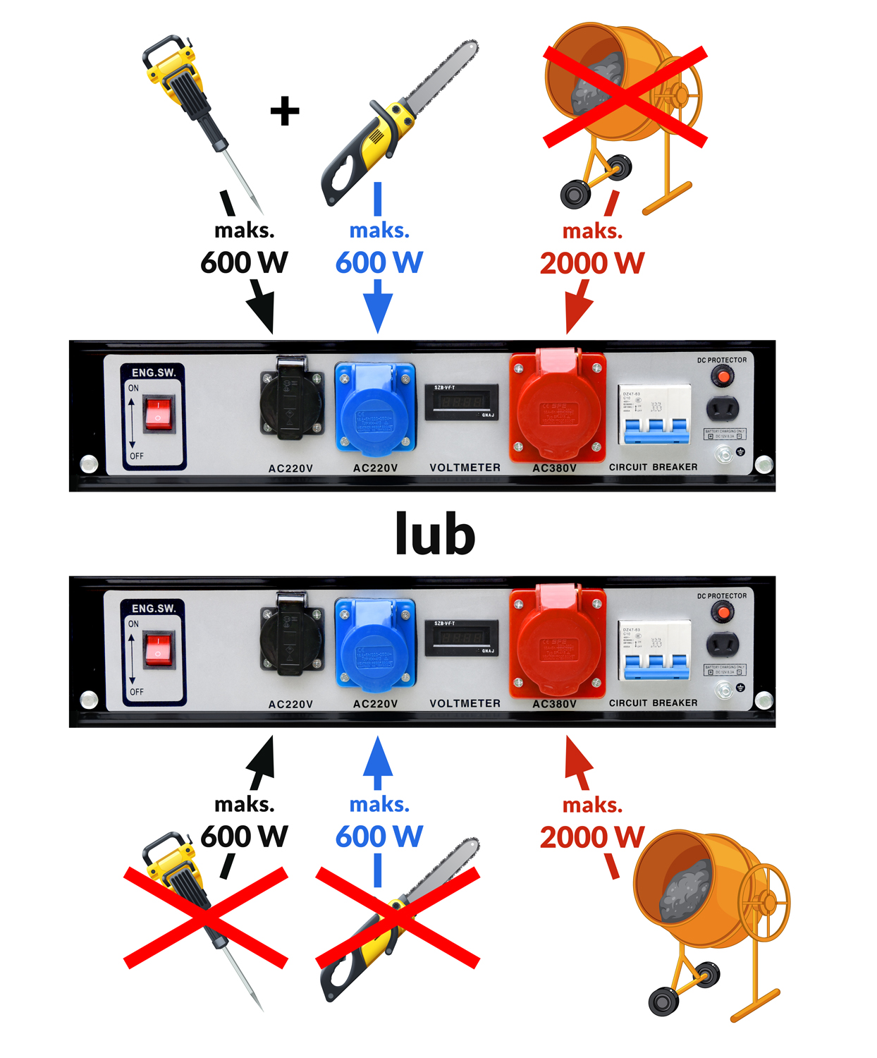 Moc pojedynczego gniazda AC220V nie może przekroczyć 600 Wat, bez obciążenia gniazda AC380V. Analogicznie do zdjęcia gniazdo AC380V nie może przekroczyć 2000 Wat, bez obciążenia gniazd jednofazowych.