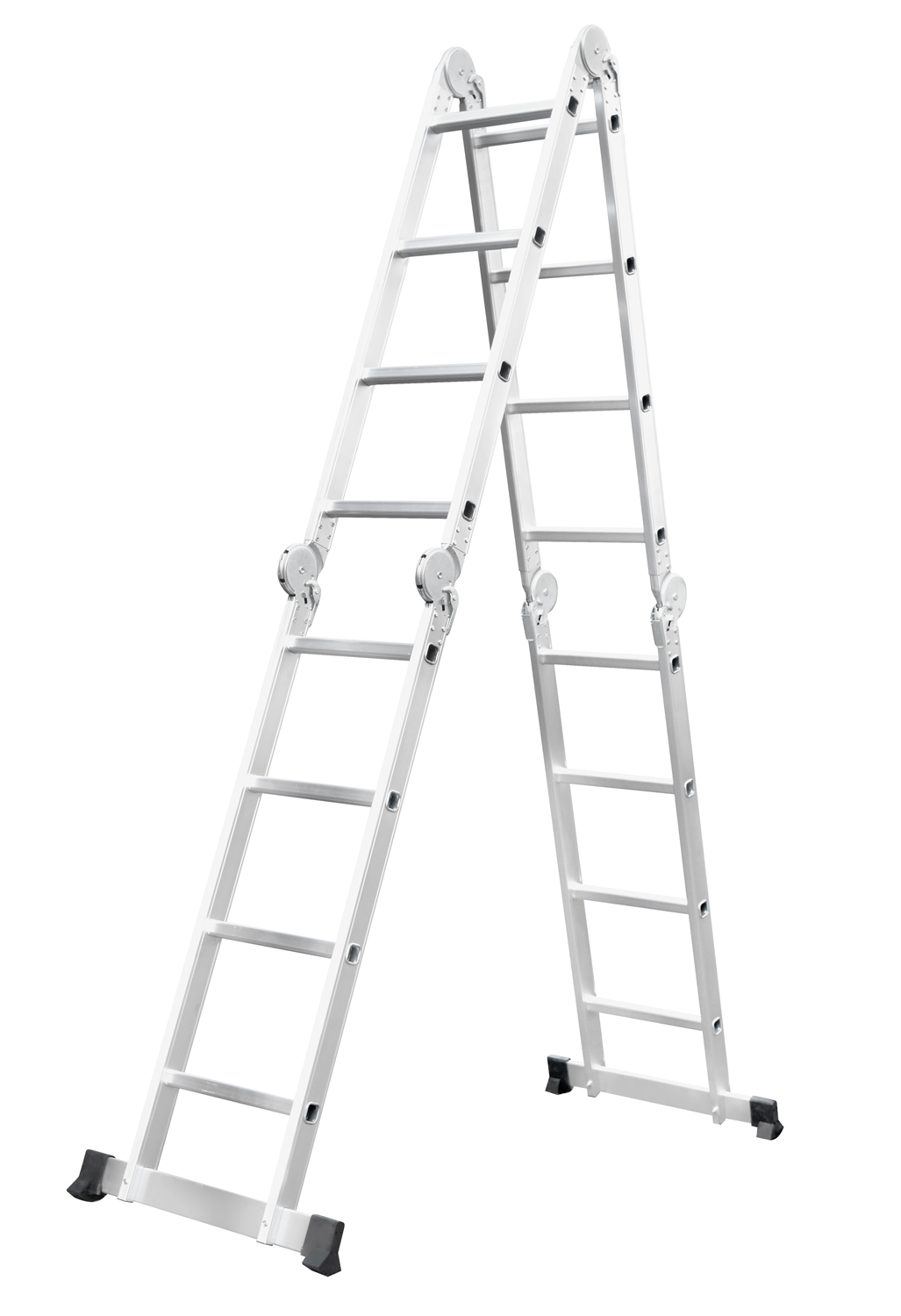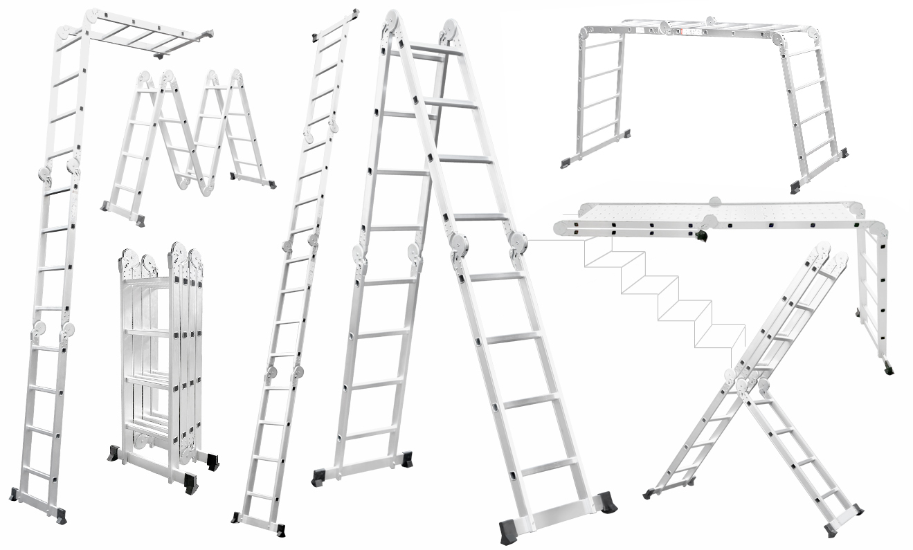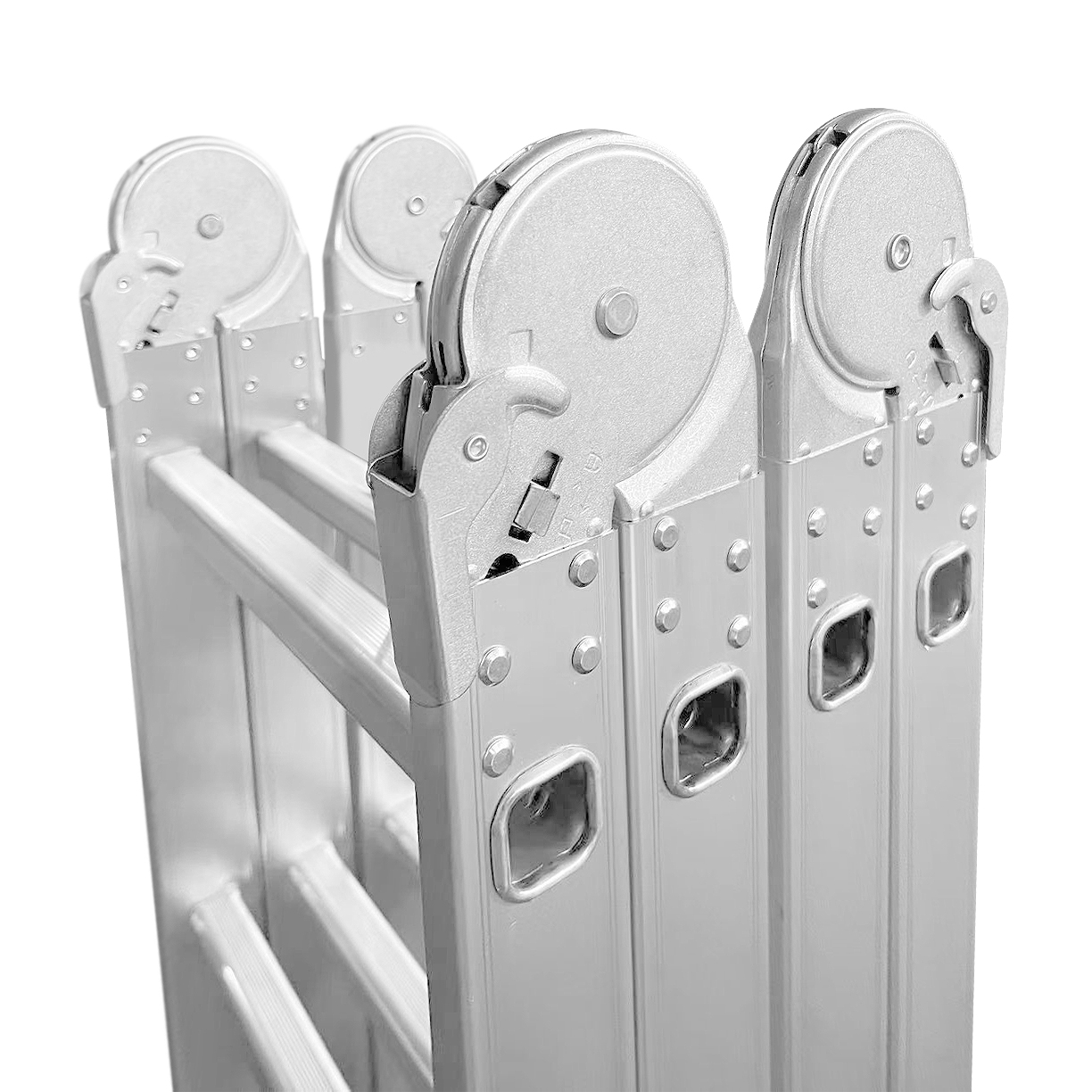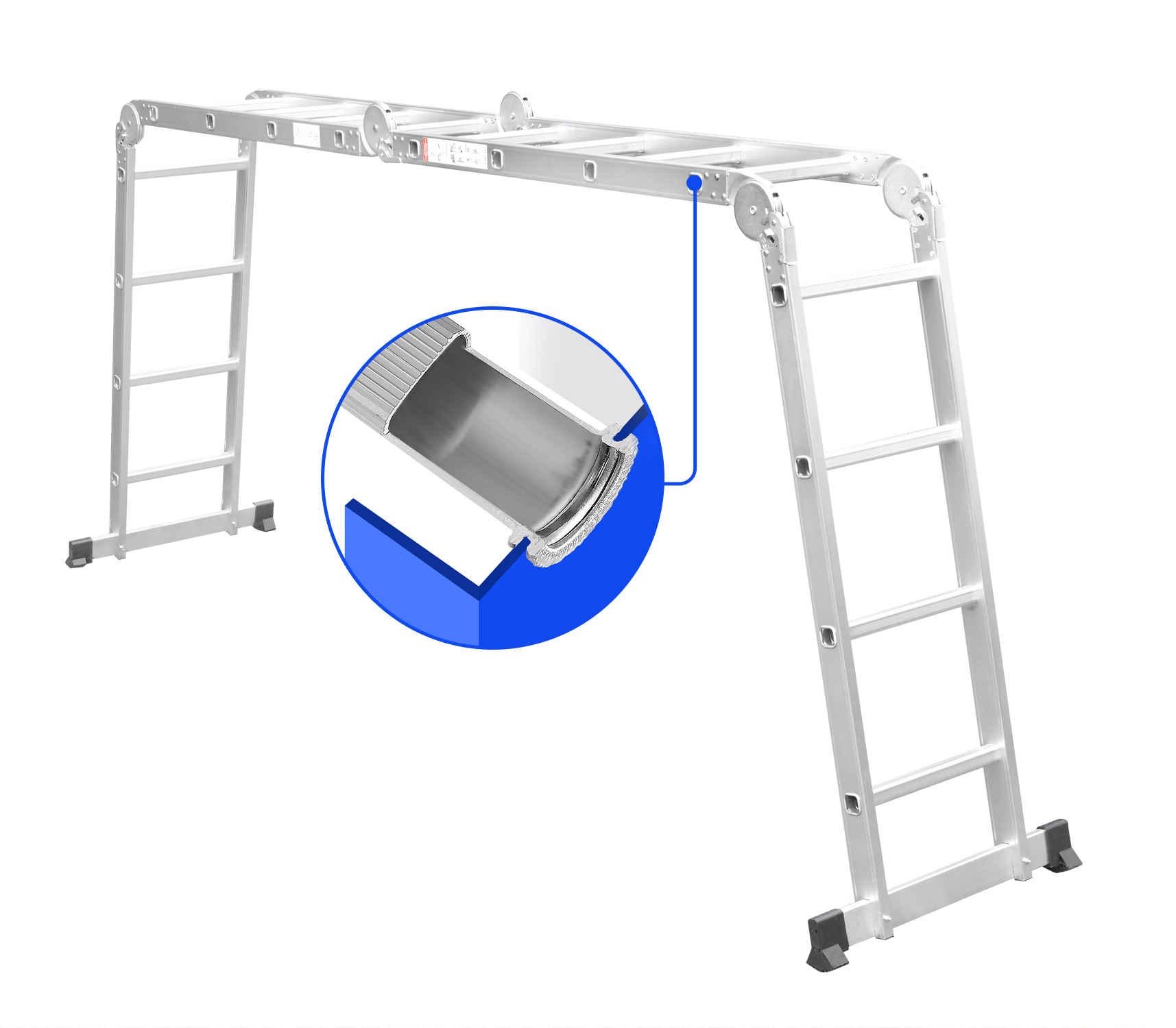Dzięki zastosowaniu 6 przegubów dzielących drabinę na 4 moduły, możesz ją ustawiać aż w 8 rozwiązaniach. Drabinę możesz dowolnie składać do różnych pozycji, a nawet ustawiać na schodach. Dostosuj ją do zadania jakie masz do wykonania.