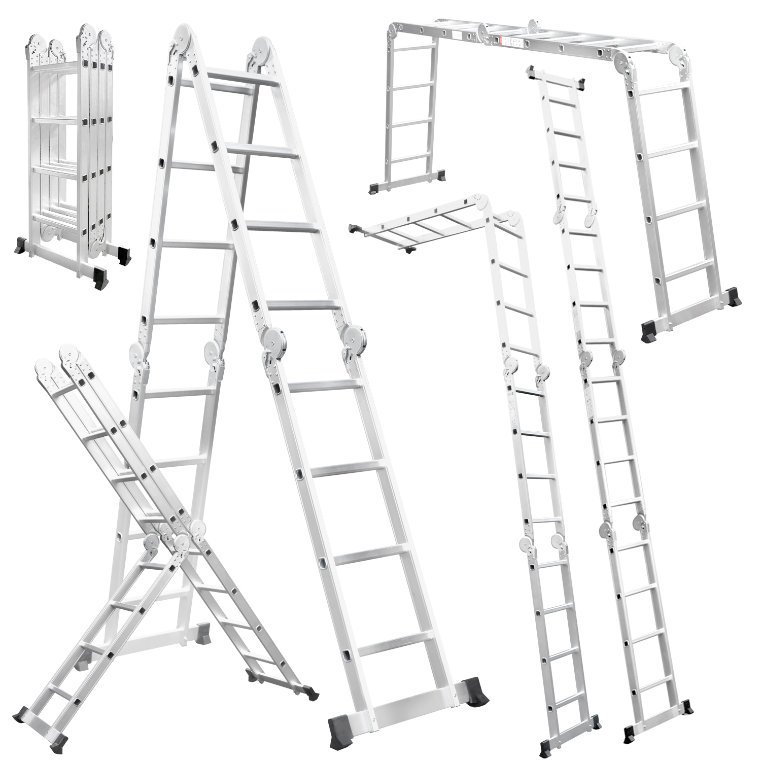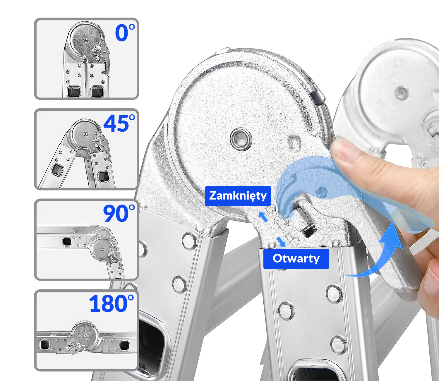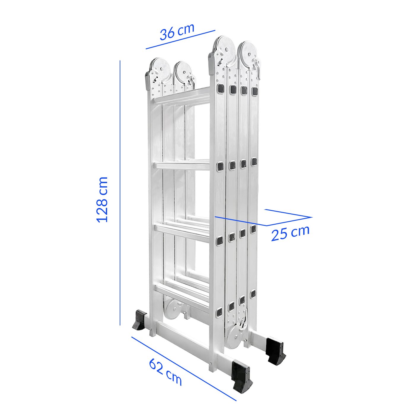 Dzięki zastosowaniu 6 przegubów dzielących drabinę na 4 moduły, możesz ją ustawiać aż w 8 rozwiązaniach. Drabinę możesz dowolnie składać do różnych pozycji, a nawet ustawiać na schodach. Dostosuj ją do zadania jakie masz do wykonania.