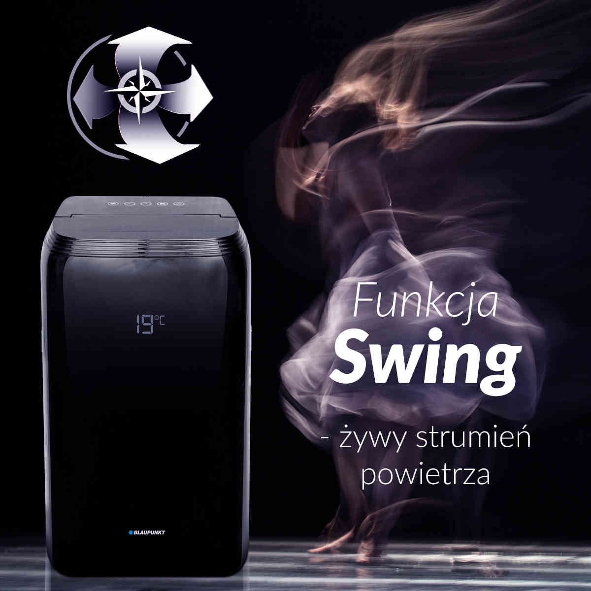 Funkcja Swing to dynamiczny czterokierunkowy nawiew powietrza. Ruchome żaluzje zamontowane w deflektorze, płynnie zmieniają kierunek chłodzącego lub ogrzewającego strumienia. Pozwala to w krótkim czasie, równomiernie uregulować temperaturę w całym pomieszczeniu.