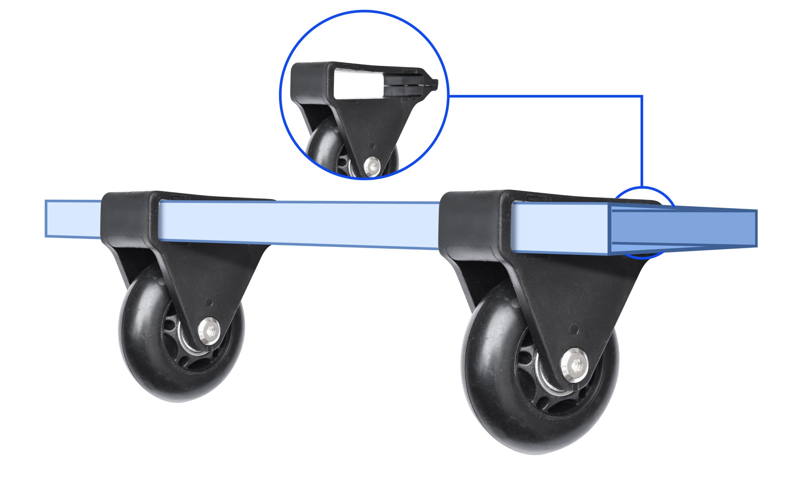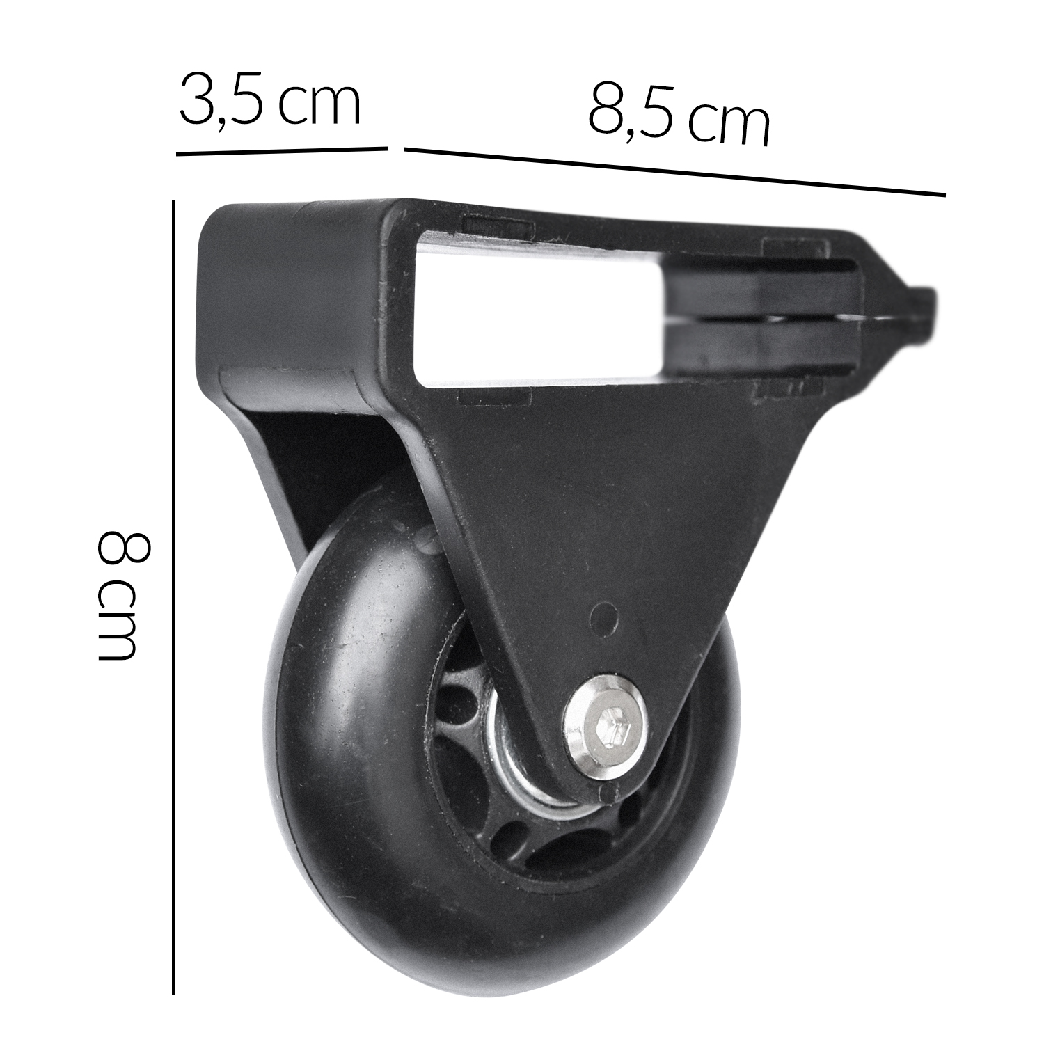 Kółka wykonane z twardego, odpornego na uszkodzenia mechaniczne tworzywa. Duża średnica kółek pozwala na wygodne toczenie, nawet przy nierównej powierzchni.