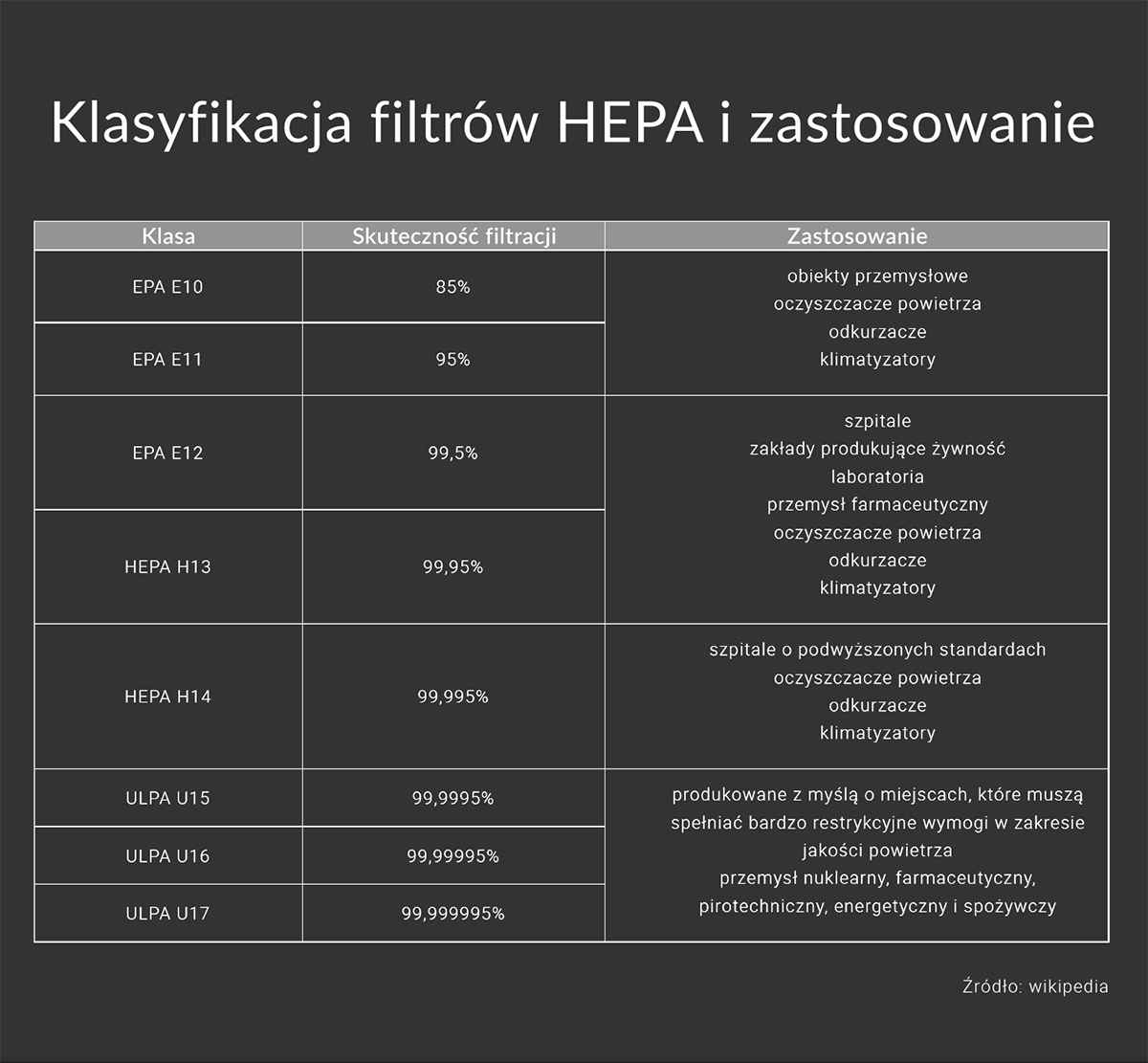 Filtr HEPA usuwa smog, roztocza kurzu, pyłki roślin, strzępki grzybów, bakterie i wirusy.