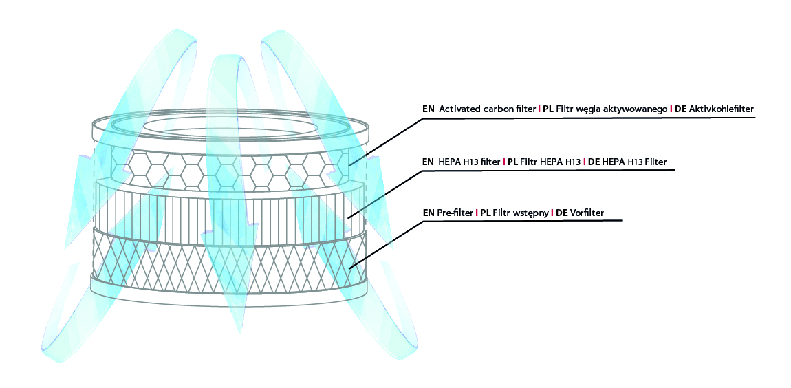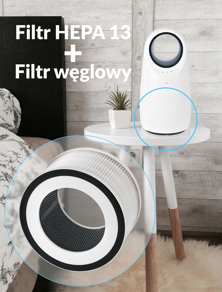 - 3 etapy oczyszczania powietrza: filtr wstępny, filtr HEPA H13, filtr węgla aktywowanego.