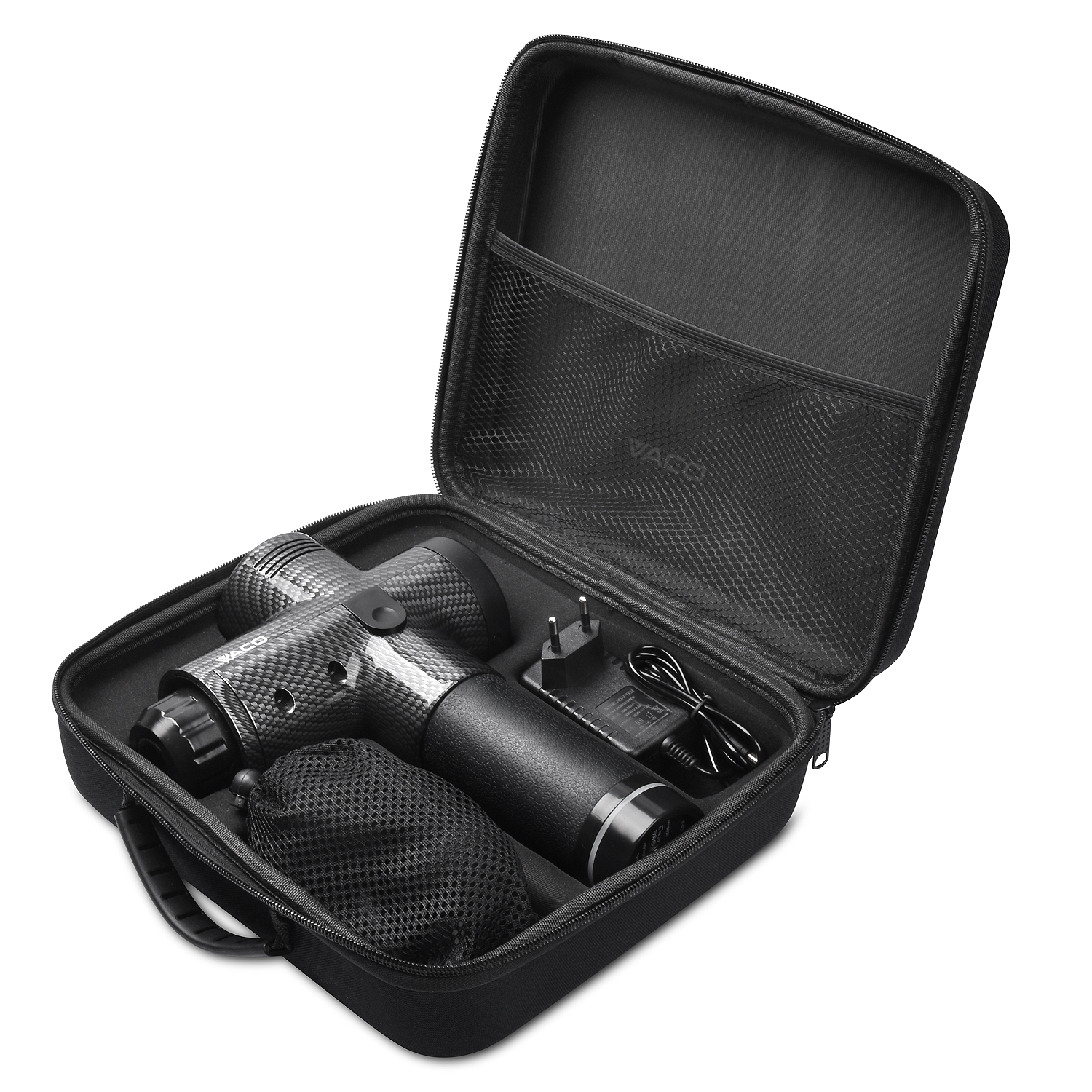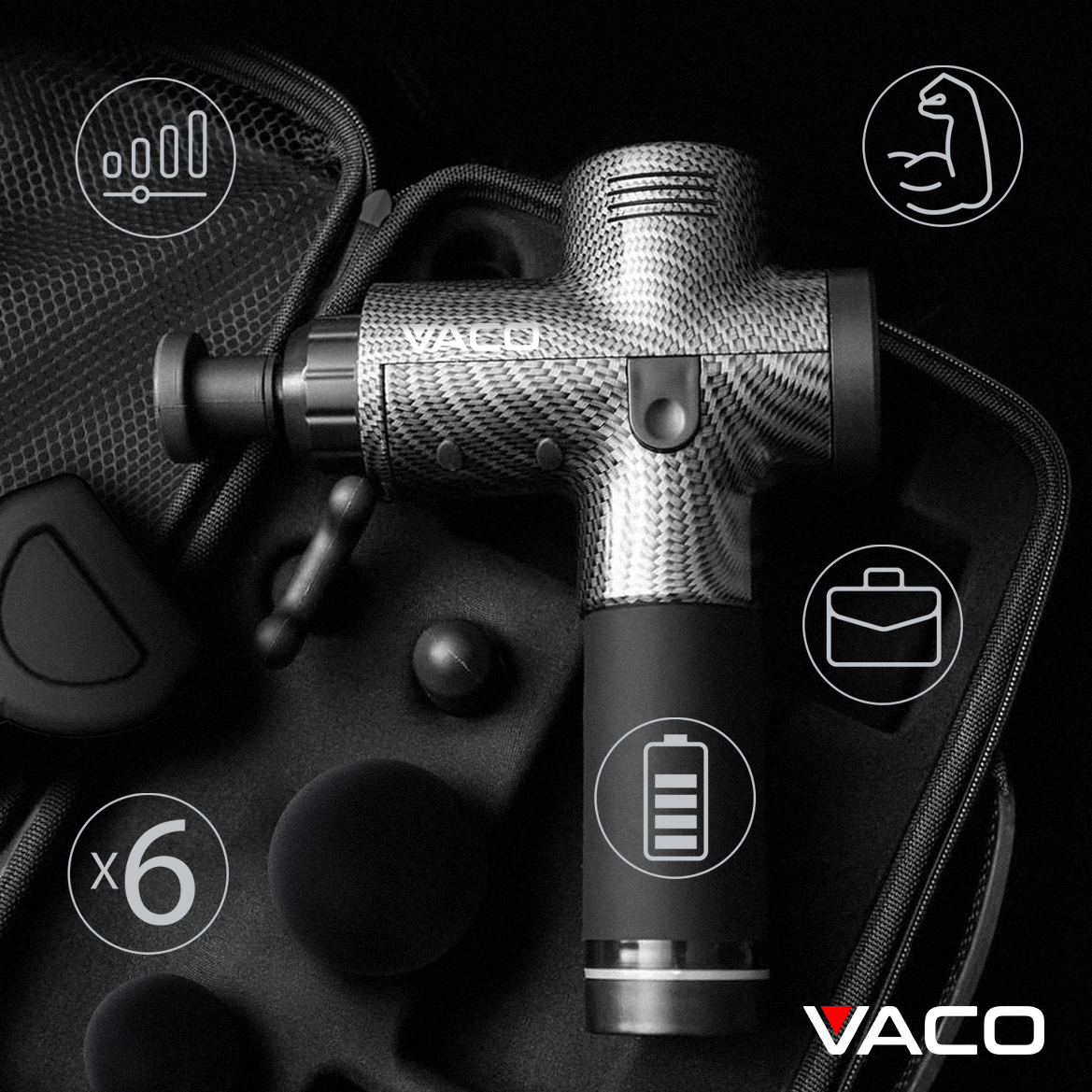 Masażer z akcesoriami zapakowany jest w estetyczną i wytrzymałą walizkę. W ten sposób możesz zabrać masażer VACO w podróż, do pracy, czy na siłownię.